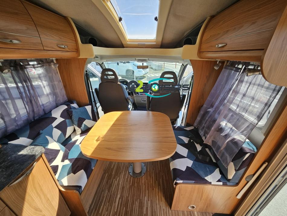 - Coin repas avec banquette face à face et sièges avants pivotants, table coulissante réglable télescopique permettant un couchage supplémentaire.