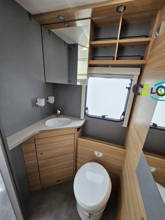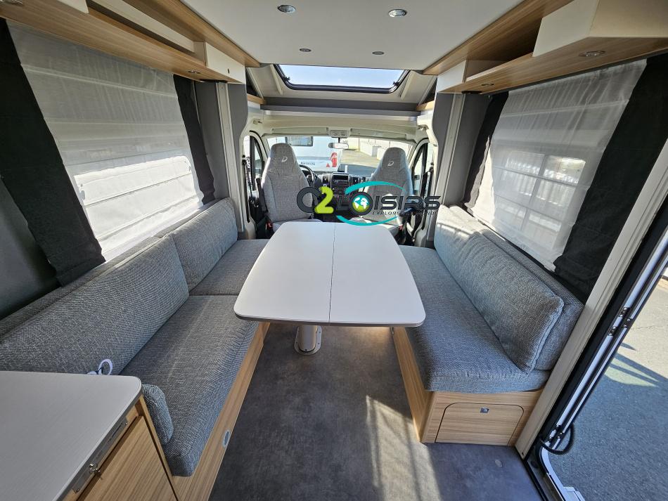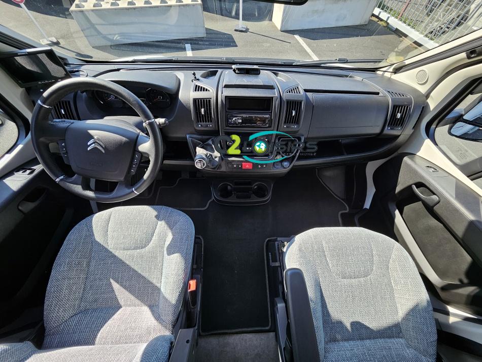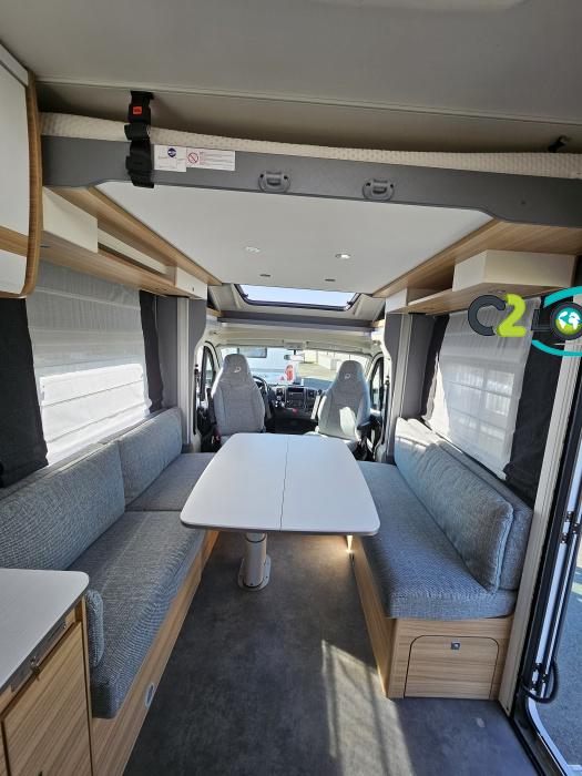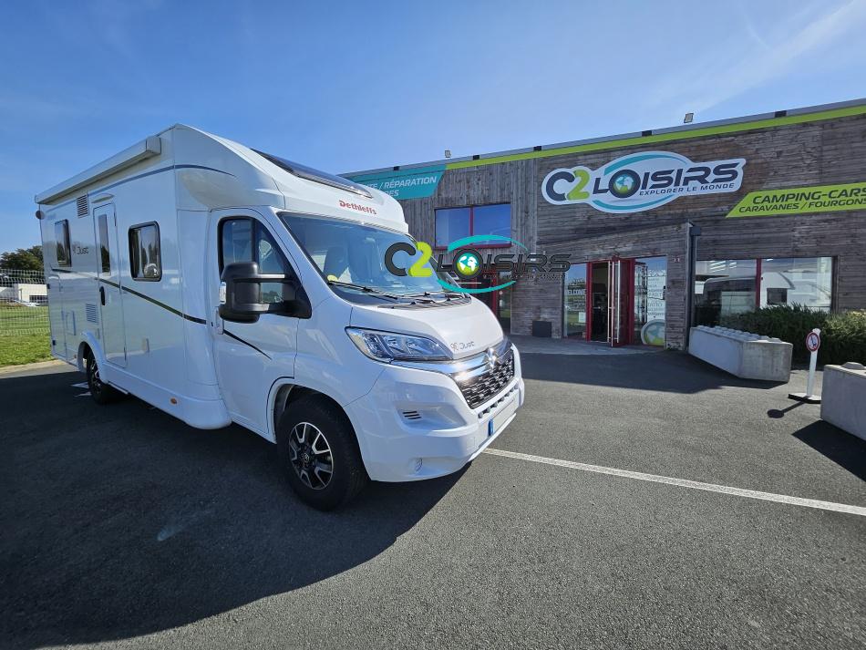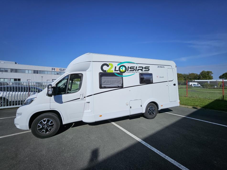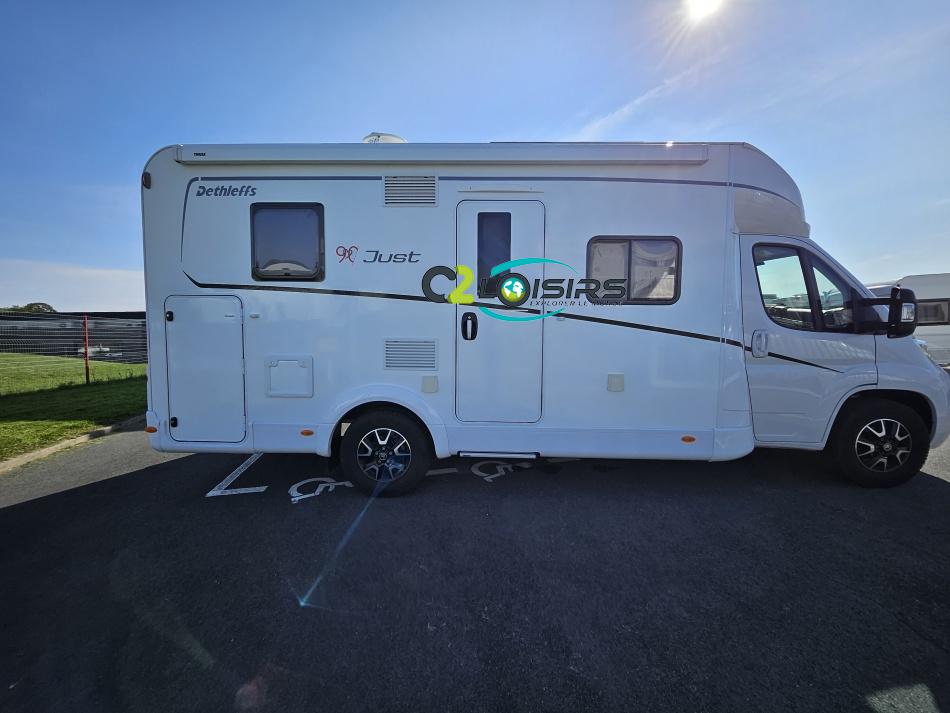 Dethleffs, modèle : Just 90 Camp 6752 PORTEUR – Citroën Jumper - Motorisation fiat 2,2 Blue HDI, 140 CV – Châssis Camping-Car - Climatisation cabine - Rétroviseurs électriques - Réservoir 90L – V.E – F.C - EBD (répartiteur électronique de freinage) - Système de freinage ABS (antiblocage des roues) - Système Electronique de Stabilité ESP - Verrouillage centralisé cabine – jantes alliage 16 pouces IMPLANTATION Cuisine : avec réchaud 2 feux - réfrigérateur 142 litres - Couchage : Lit de pavillon (2000 x 1500 cm) – Toilette spacieux : WC à cassette, Douche séparée - dressing - Banquette face à face avec table centrale - Chauffage / chauffe-eau Truma Combi 6 - grand Salon - sièges pivotants, réglables en hauteur - Occultation cabine coulissante plissée de série REMIS – grand salon 8 places - Grande soute traversante avec coffre à skie – coffre 2 bouteilles de gaz OPTIONS : Store extérieur– Caméra de recul – Panneau solaire 100w – inverseur de gaz TRUMA – Antenne hertzienne TV LCD X1 – marchepied – moustiquaire - REMIS cabine INFORMATION UTILES : L 6.95m x l 2.33m x h 2.94m - PTAC/CU (kg) : 3500/643 - Places C.G./nuit/repas : 4/4/5 Dimensions porte de soute droite/maximale 1150 x 600 Dimensions porte de soute gauche/maximale 1700 x 550