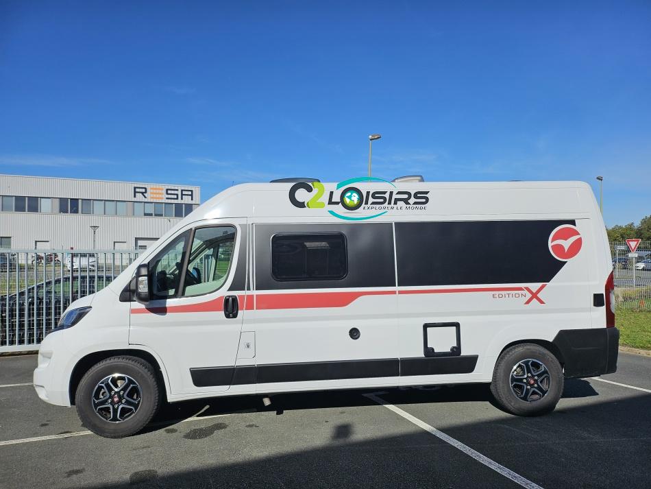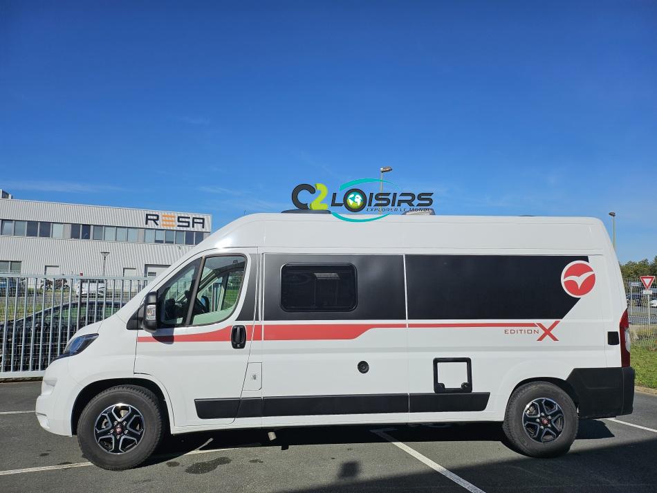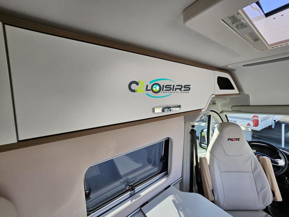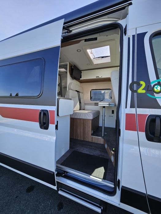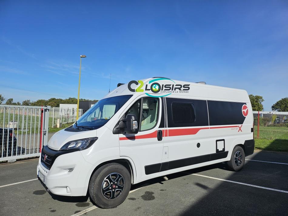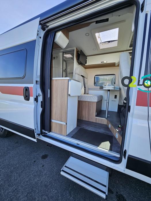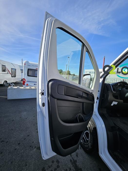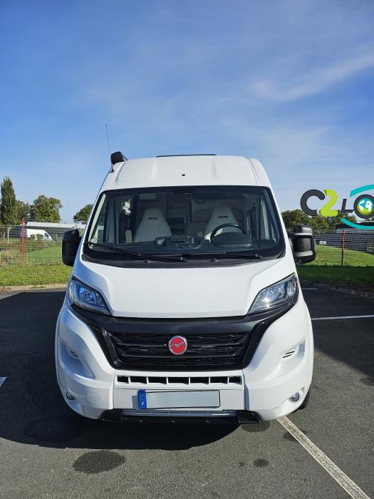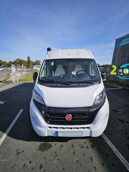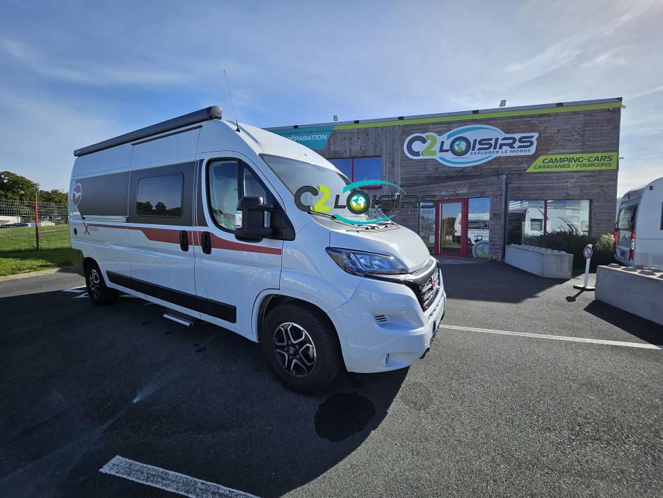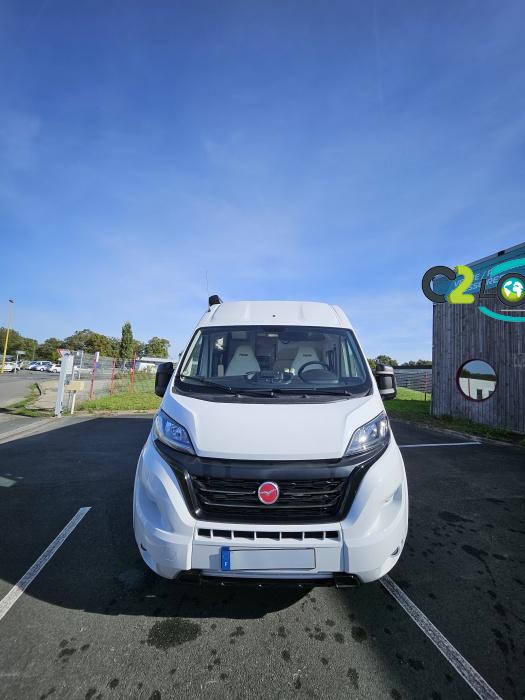 PORTEUR : FIAT DUCATO 2.2 l 140ch b.a. Sièges pivotants avec housse - Station multimédia avec caméra de recul - Jantes alu 16 pouces Système de navigation GPS - Commandes autoradio au volant – régulateur – limiteur – boite automatique – climatisation – boite à gant réfrigéré – vide poche – dégagement cabine Rétroviseurs électriques - Réservoir 90L – V.E – F.C - EBD (répartiteur électronique de freinage) - Système de freinage ABS (antiblocage des roues) - Système Electronique de Stabilité ESP Pack complète sélection INCLUS : Pack Châssis, Pack confort, Pack Châssis design, Finition X IMPLANTATION Cuisine : avec réchaud 2 feux - Réfrigérateur 138L + Freezer à compression - Couchage : Lit transversal (135 x 190 cm) – Toilette : WC à cassette Thetford amovible – douche - Banquette / siège en face à face avec table centrale - Chauffage / chauffe-eau Truma Combi – store coulissant plissée de série REMIS – coffre 2 bouteilles de gaz 13kg - OPTIONS : Store extérieur fiamma– Caméra de recul – Panneau solaire 100w souple –détendeur gaz TRUMA monocontrôle –TV smart LCD – marchepied électrique– moustiquaire de porte latéral - REMIS cabine – porte 2 vélos INFORMATION UTILES : L 6.99m x l 2.05m x h 2.67m - PTAC/CU (kg) : 3500/617 - Places C.G./nuit/repas : 4/3/4 Eaux propres : 110L Eaux usées : 80L