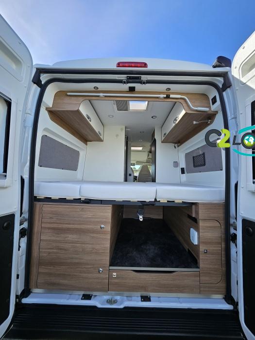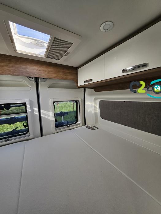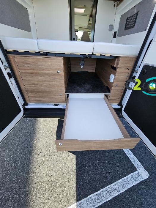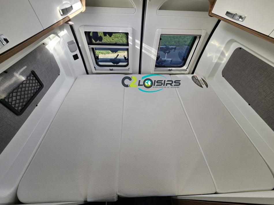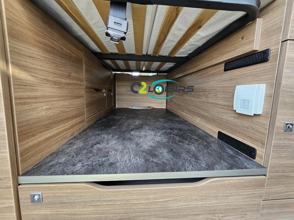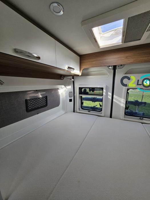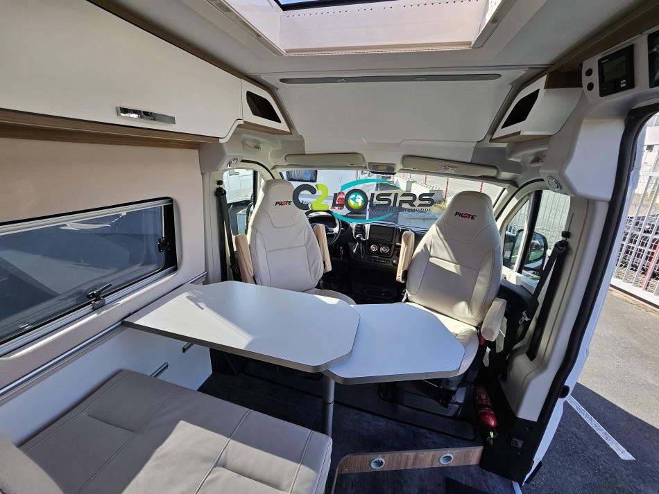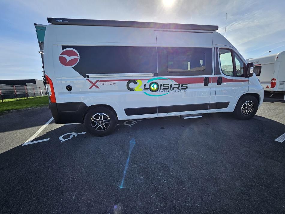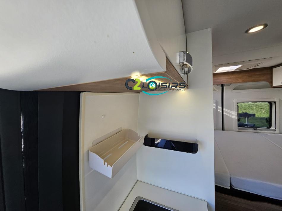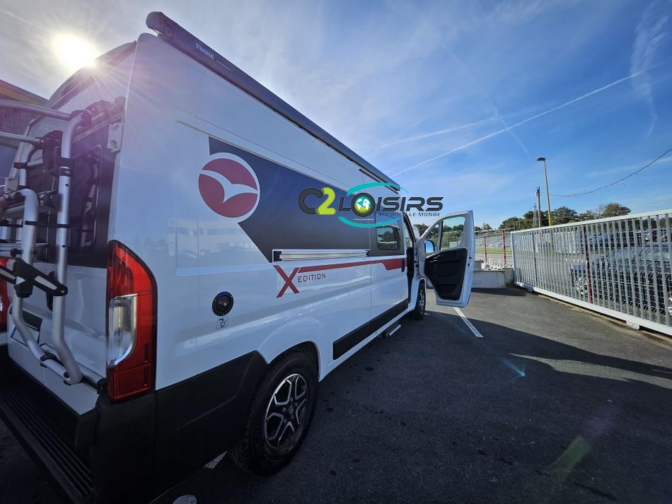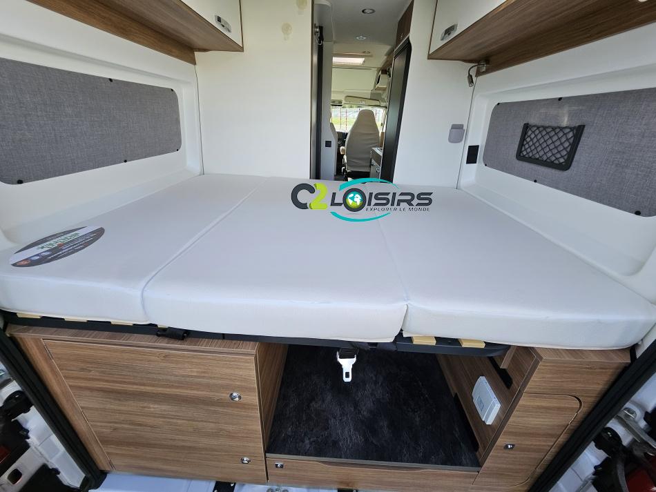 PORTEUR : FIAT DUCATO 2.2 l 140ch b.a. Sièges pivotants avec housse - Station multimédia avec caméra de recul - Jantes alu 16 pouces Système de navigation GPS - Commandes autoradio au volant – régulateur – limiteur – boite automatique – climatisation – boite à gant réfrigéré – vide poche – dégagement cabine Rétroviseurs électriques - Réservoir 90L – V.E – F.C - EBD (répartiteur électronique de freinage) - Système de freinage ABS (antiblocage des roues) - Système Electronique de Stabilité ESP Pack complète sélection INCLUS : Pack Châssis, Pack confort, Pack Châssis design, Finition X IMPLANTATION Cuisine : avec réchaud 2 feux - Réfrigérateur 138L + Freezer à compression - Couchage : Lit transversal (135 x 190 cm) – Toilette : WC à cassette Thetford amovible – douche - Banquette / siège en face à face avec table centrale - Chauffage / chauffe-eau Truma Combi – store coulissant plissée de série REMIS – coffre 2 bouteilles de gaz 13kg - OPTIONS : Store extérieur fiamma– Caméra de recul – Panneau solaire 100w souple –détendeur gaz TRUMA monocontrôle –TV smart LCD – marchepied électrique– moustiquaire de porte latéral - REMIS cabine – porte 2 vélos INFORMATION UTILES : L 6.99m x l 2.05m x h 2.67m - PTAC/CU (kg) : 3500/617 - Places C.G./nuit/repas : 4/3/4 Eaux propres : 110L Eaux usées : 80L