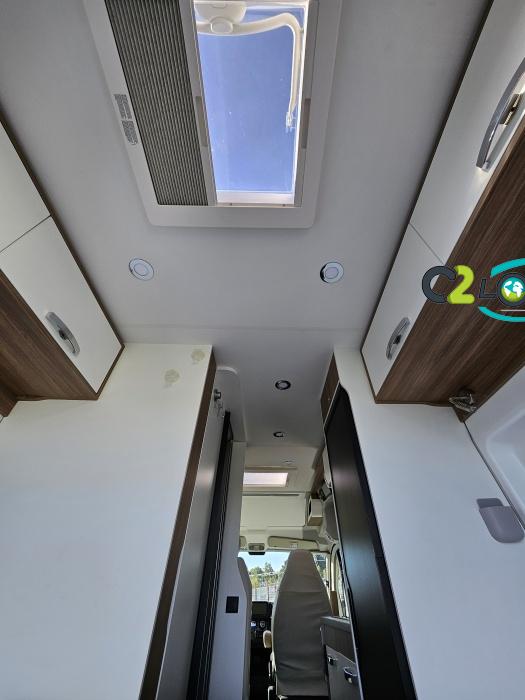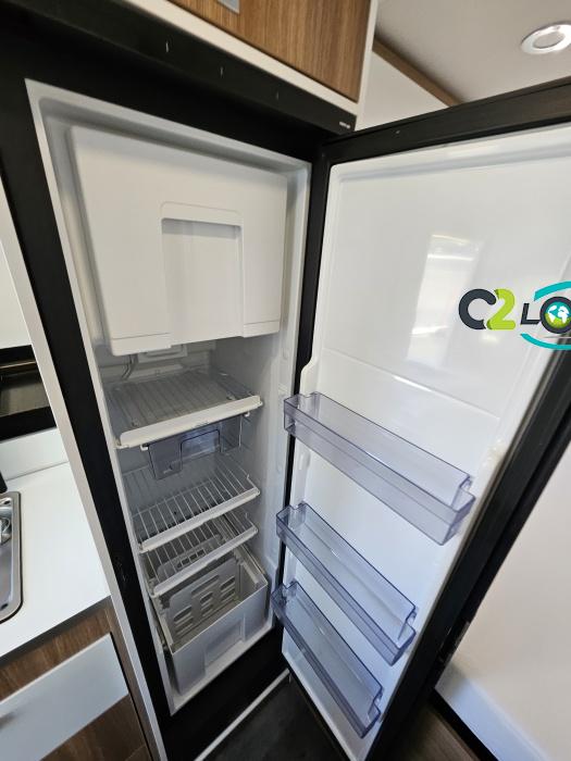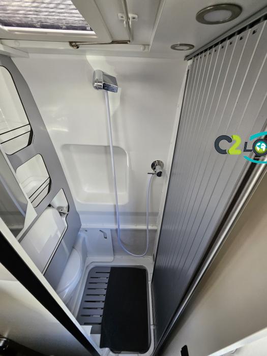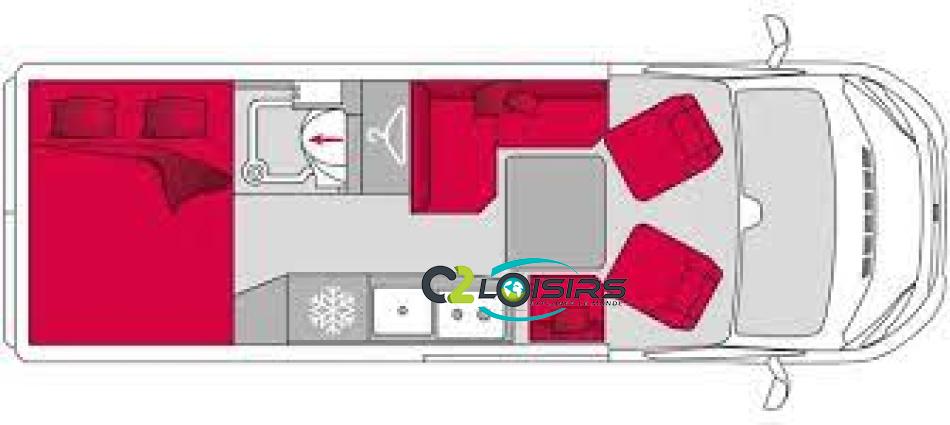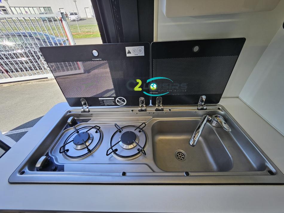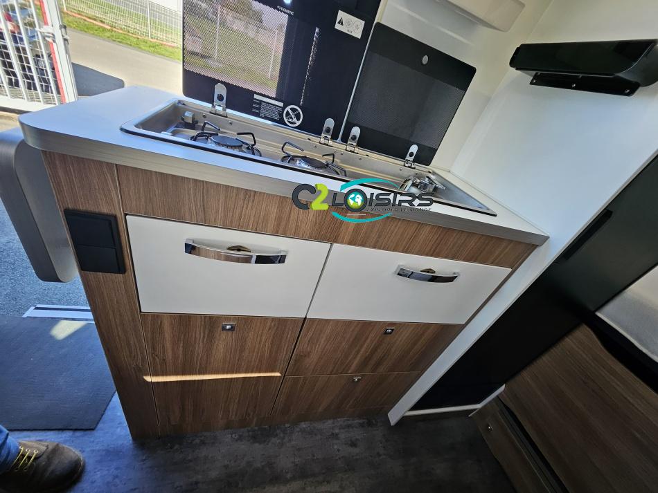 Cuisine : avec réchaud 2 feux - Réfrigérateur 126L + Freezer à compression - Couchage : Lit transversal (135 x 180 cm) – Toilette : WC à cassette Thetford amovible – douche - Banquette / siège en face à face avec table centrale - Chauffage / chauffe-eau Truma Combi – store coulissant plissée de série REMIS – coffre 2 bouteilles de gaz 13kg -