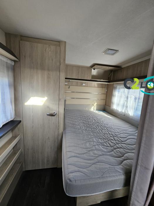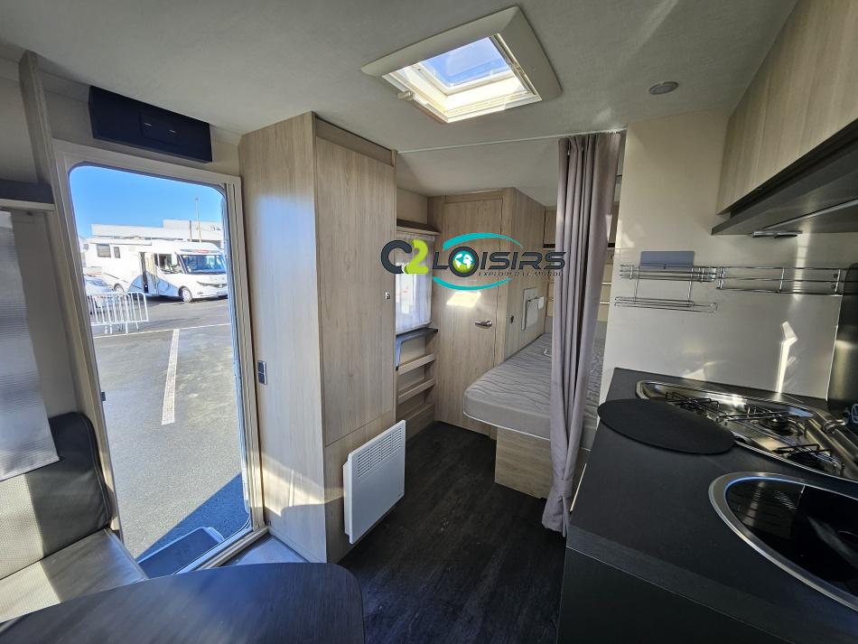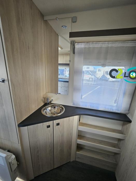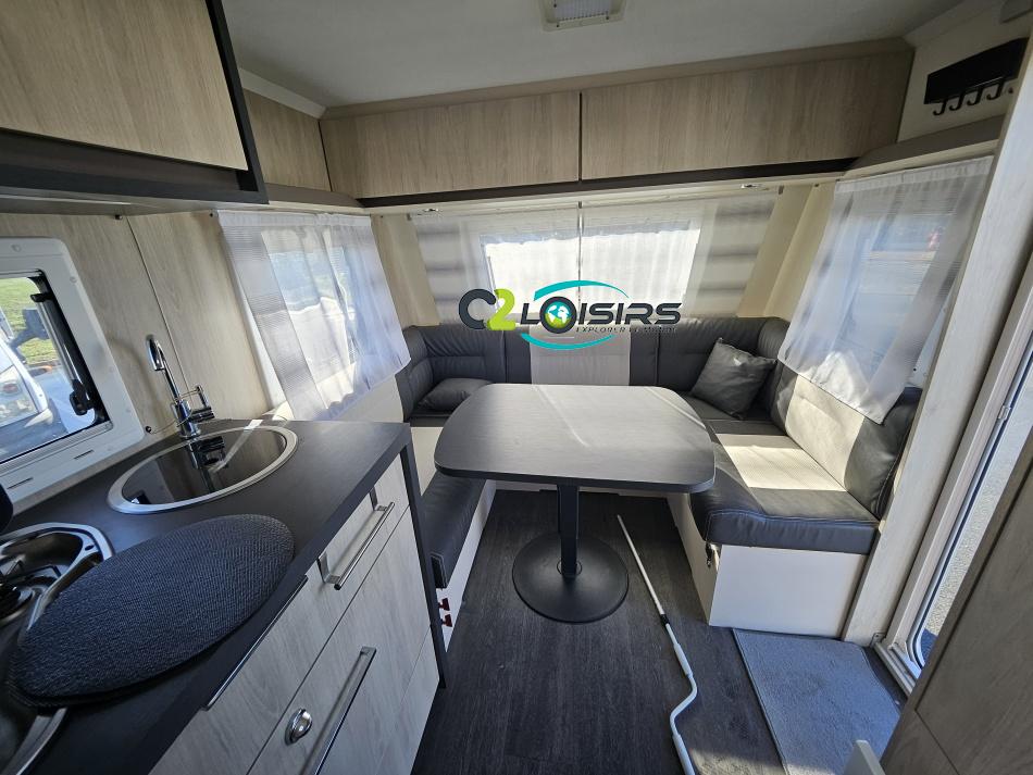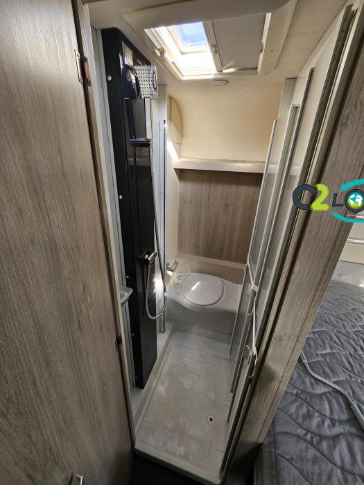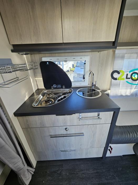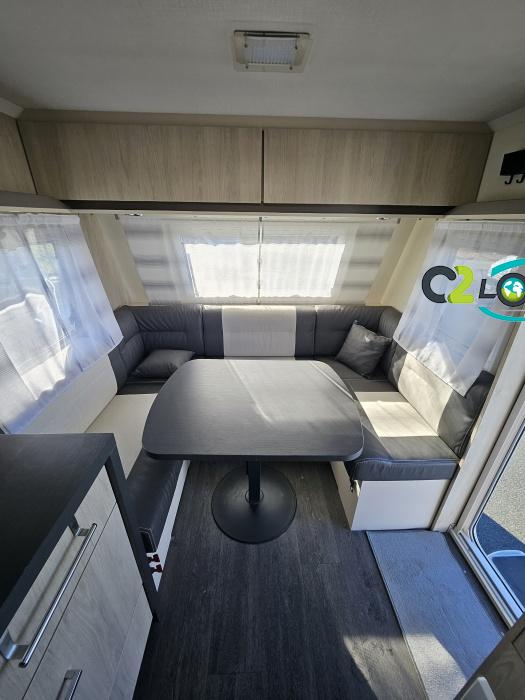 Grand salon en U convertible en Lit 2 personnes Lit 140 - plaques gaz 3 feux - Évier inox - frigo 146L - tiroir Chauffe eau électrique 14 L - panneau de contrôle - Douche - WC Thetford - Auvent Gonflable trigano - Antenne télé - Déplace caravane GO2 - Antilacets